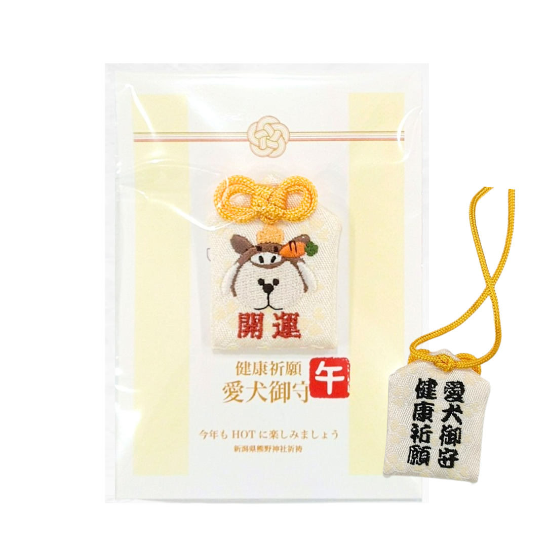 表面は干支の「午」を纏った白い犬のイラストと「開運」の文字を刺繍。